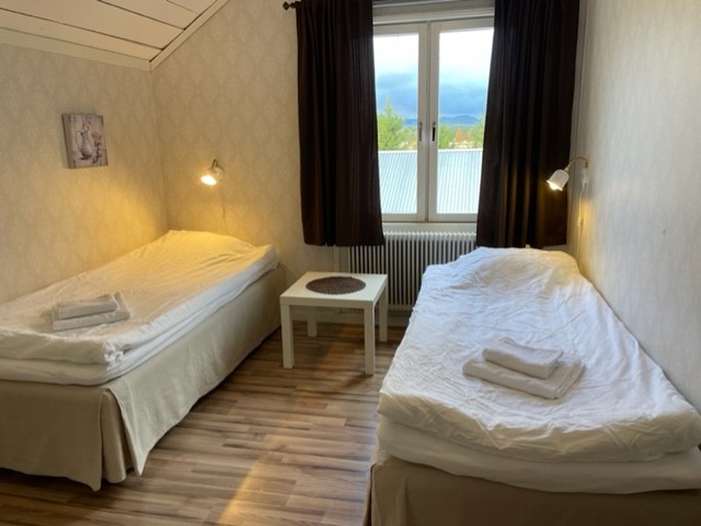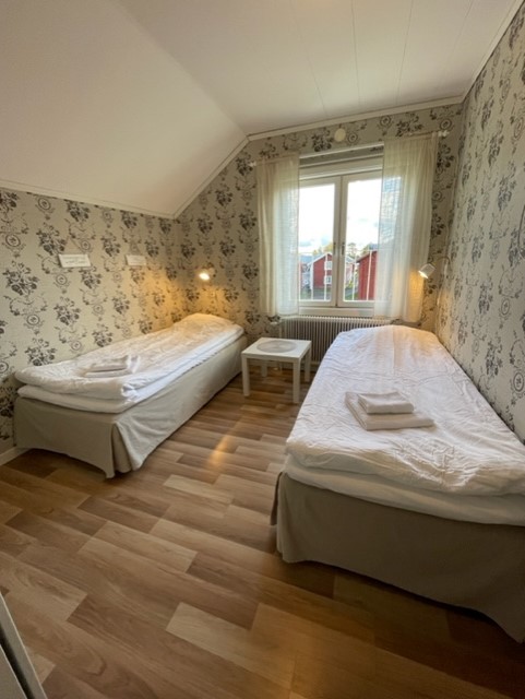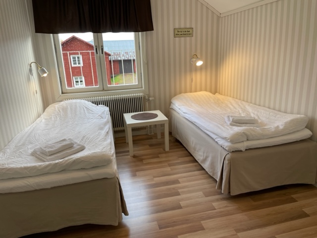 Här bor du bra i trivsamma tvåbäddsrum, sängarna är 90cm breda, alla rum har handfat och tv. Dusch och wc i nära anslutning. Avresestäd ingår. Vi hälsar er varmt välkomna.